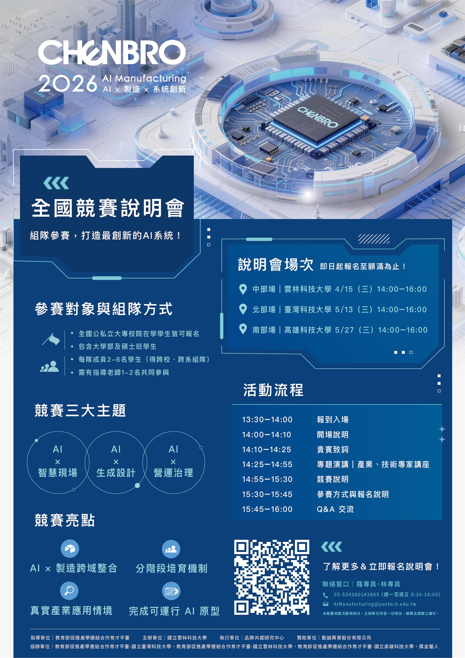 ()中部場:114415日(星期三)14時至16時,於國立雲林科技大學產學研大樓B1樓雲集廳(AI001)辦理。
