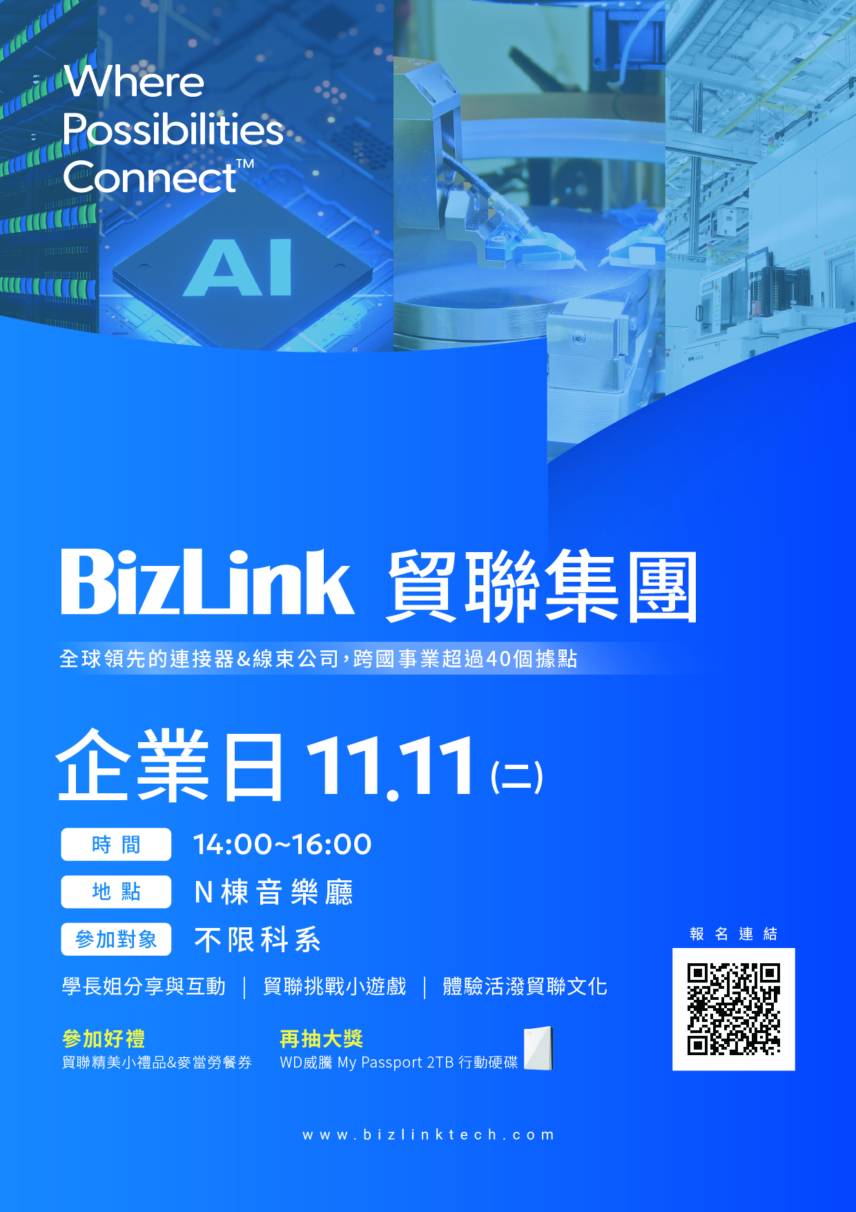 為協助學生了解跨國企業運作與產業趨勢,並拓展就業視野,特轉知 「BizLink貿聯集團企業日」 活動資訊,敬請轉知貴系學生踴躍參與,亦誠摯歡迎老師帶班前往參加,謝謝。